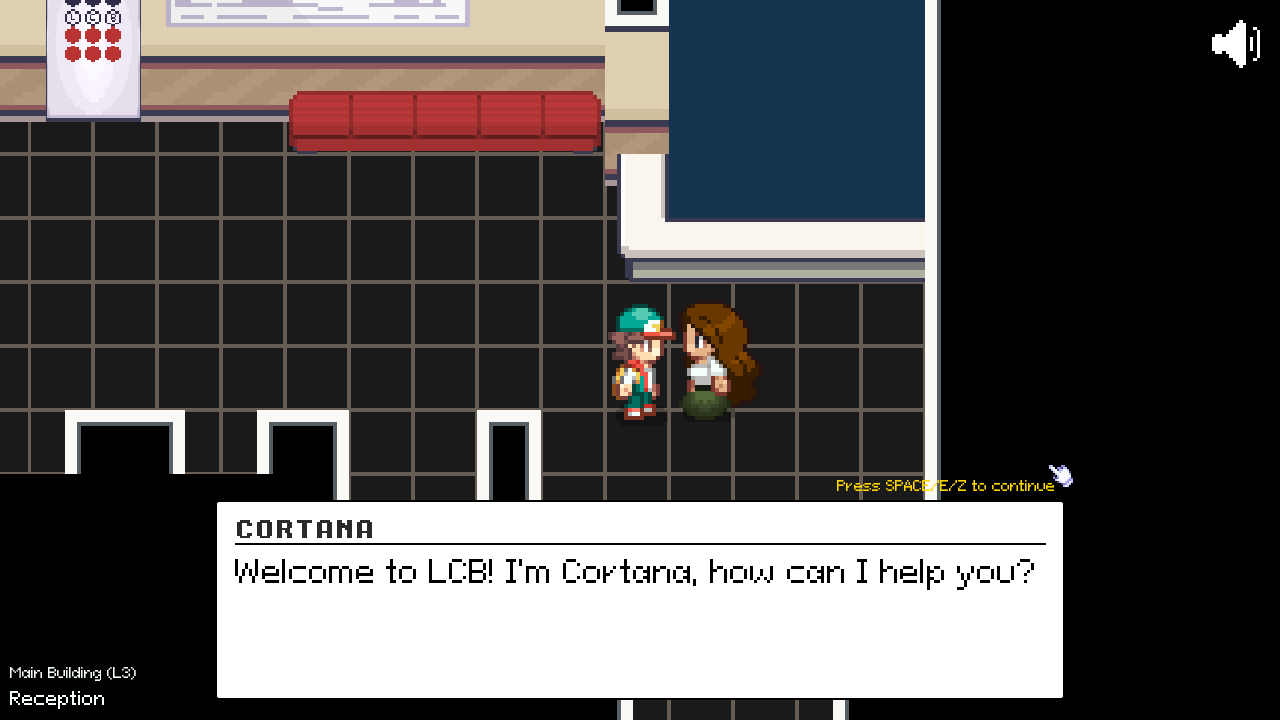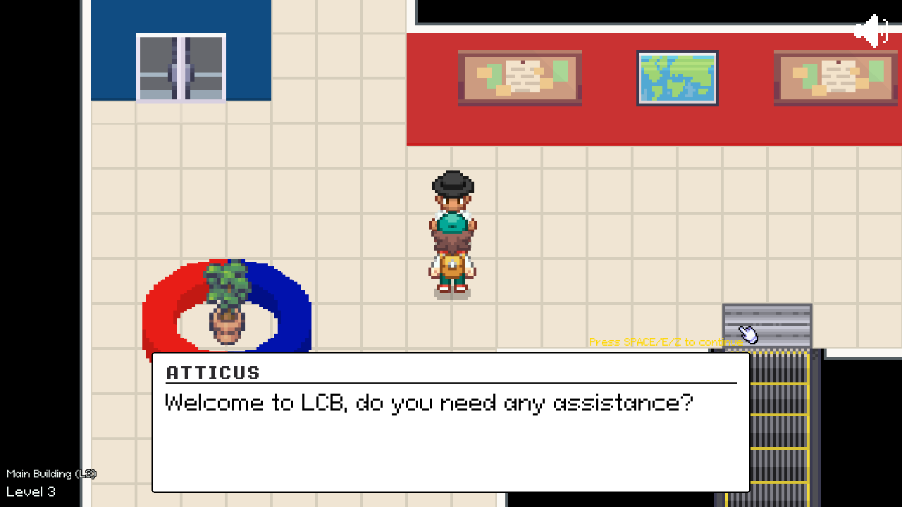 - SPACE/Z/E to interact, continue dialog, and pick dialog choices