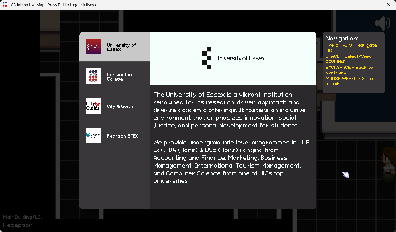 An interactive map of Laksamana College of Business, situated in Brunei Darussalam. Made with Python + Pygame CE. The application aims to cater introverted individuals and for those unable to visit the campus in person for pre-class preparation or to simply look around and learn about LCB.